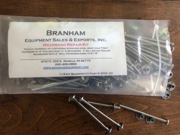 This is a universal kit containing 110 Each of our custom stainless steel brad hole T-Nut fasteners w/4” phillips head ¼” x 20 screws. It will repair trailer wearbands with 4” wall thickness down to 5/16”. You will be able to refasten both sides of the trailers wearband back in place with 2 fasteners per posts on 24" centers throughout.